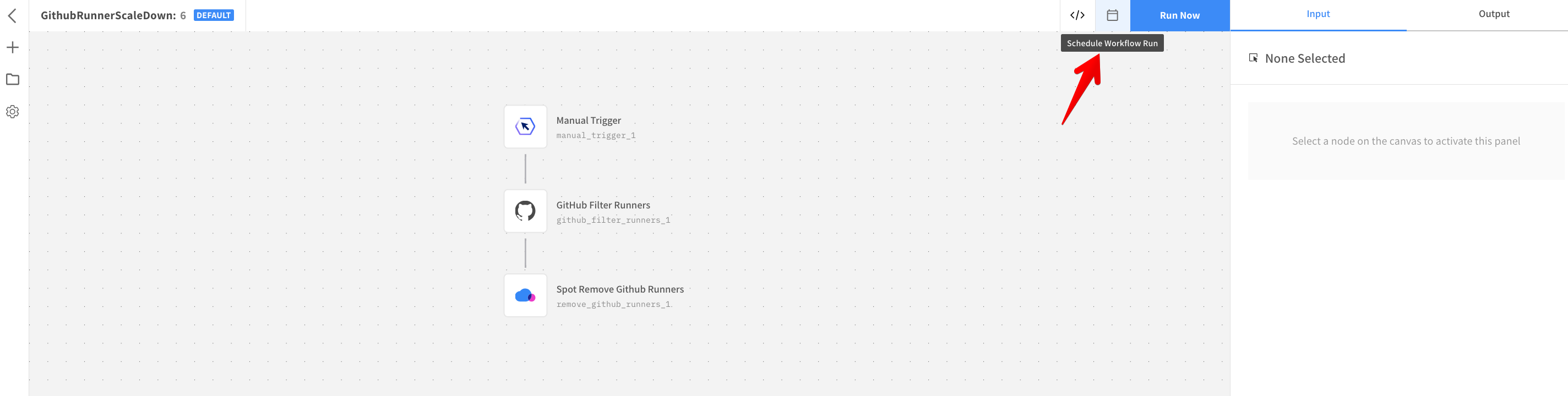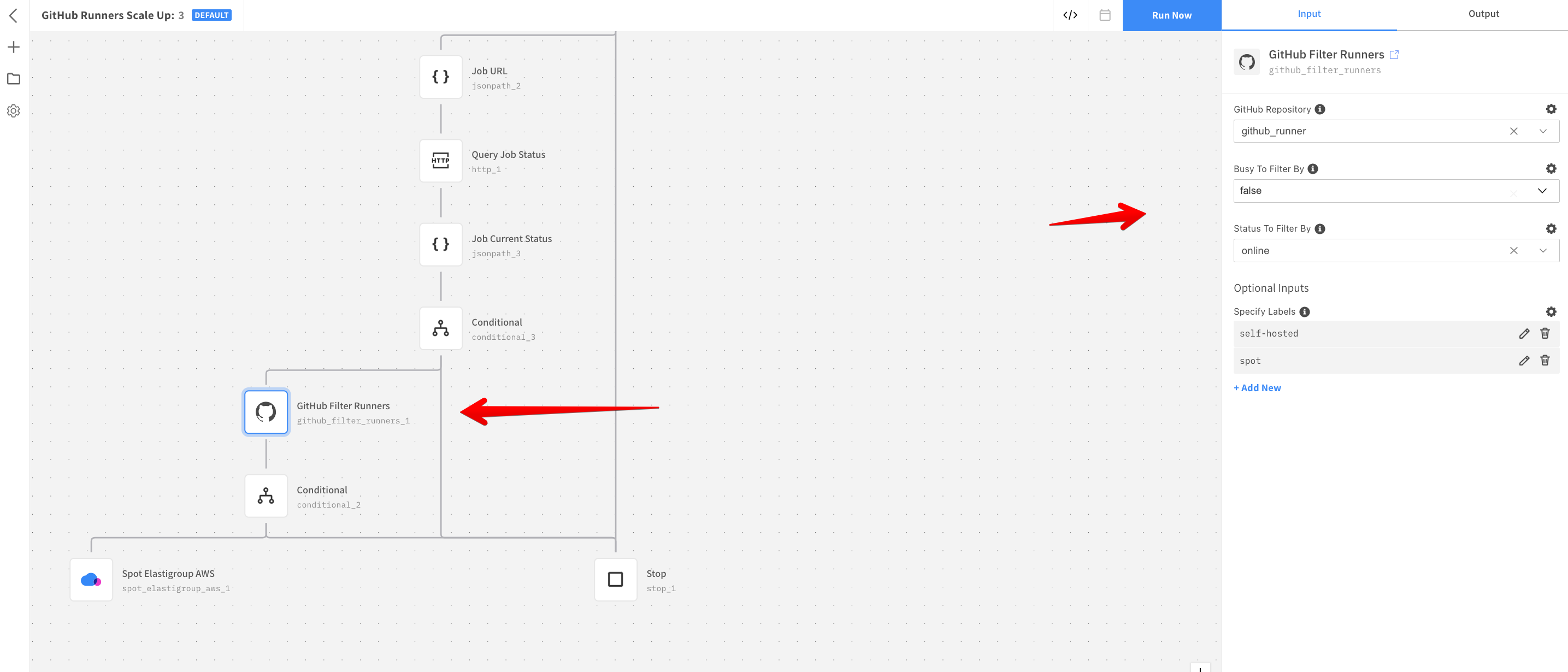 - Click the GitHub Filter Runners action node.