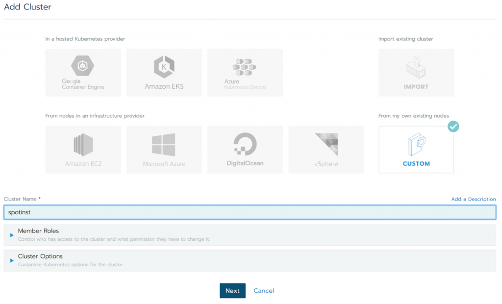 1. Spot integrates with Rancher 2.0 through the custom cluster configuration.