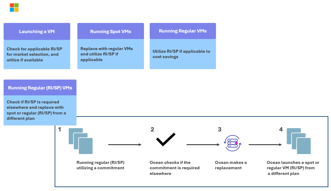 This scenario involves dynamic commitment management. Ocean monitors whether an RI or SP could be better utilized elsewhere. When identified, Ocean replaces the current instance with a spot or regular (RI/SP) VM from a different plan, following this process:
