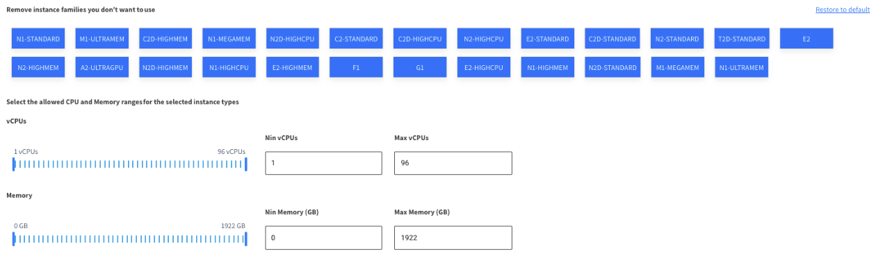 If you have a reason not to use certain machine types, you can deselect those family types. For example, your application may be specifically tuned for newer versions of CPU offered in the later families, and the older models cause performance issues. Deselect those families.