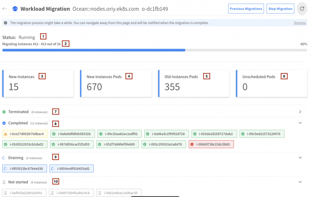- Terminate Instances – Ocean terminates the old instances once the pods that reside in them are migrated, and the old instances are fully drained.